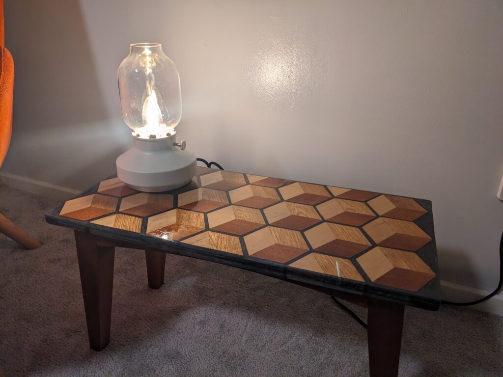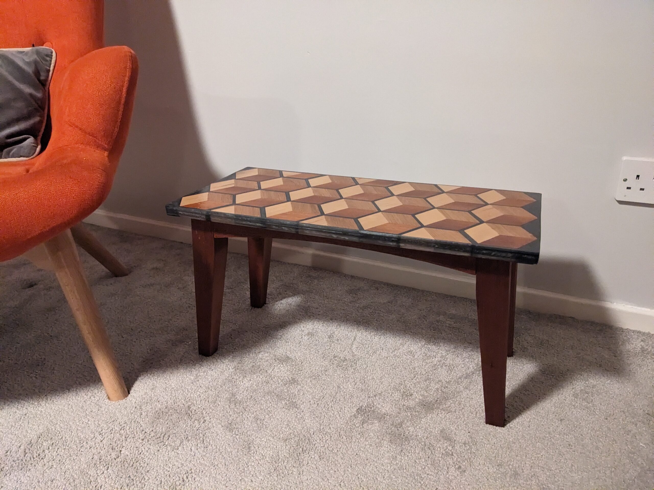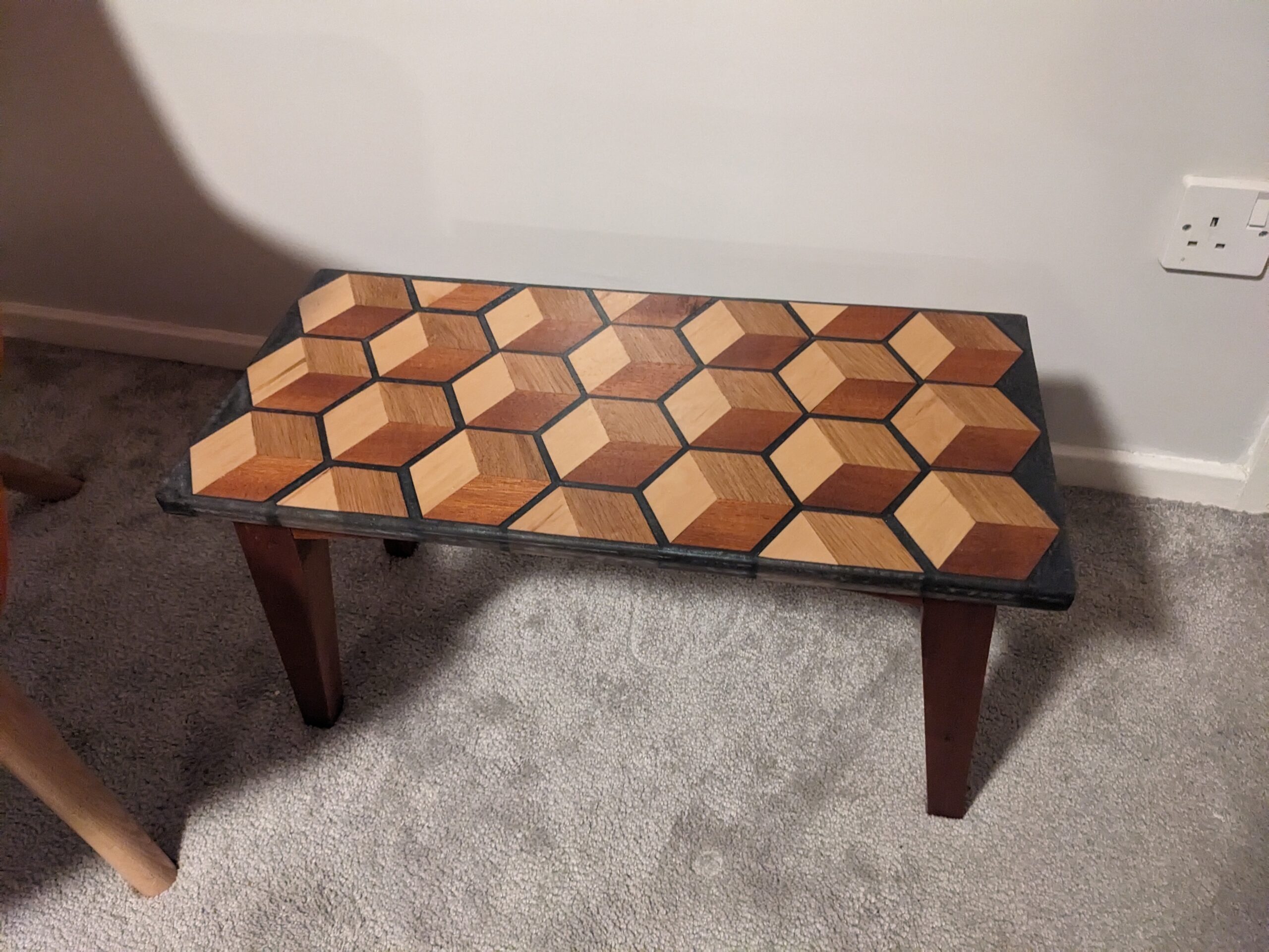 Unique plywood patterned top, with solid angular oak legs and adjustalbe feet.