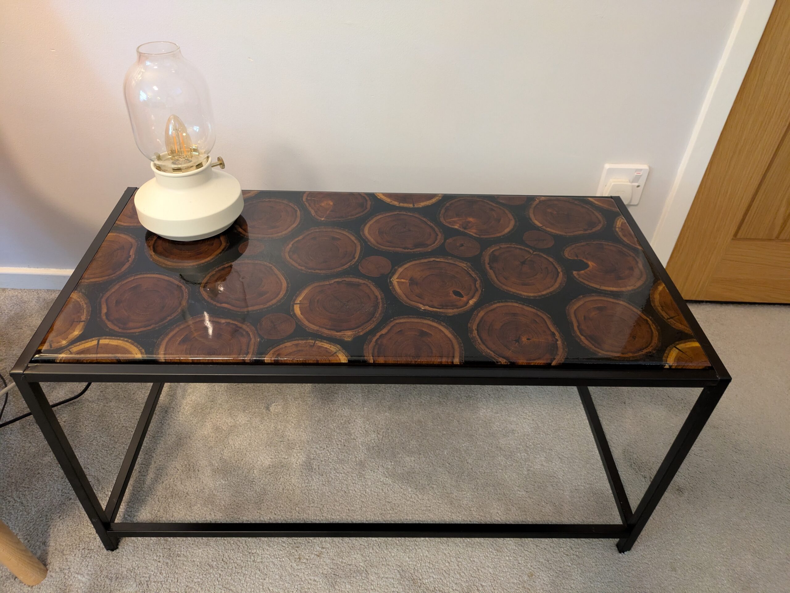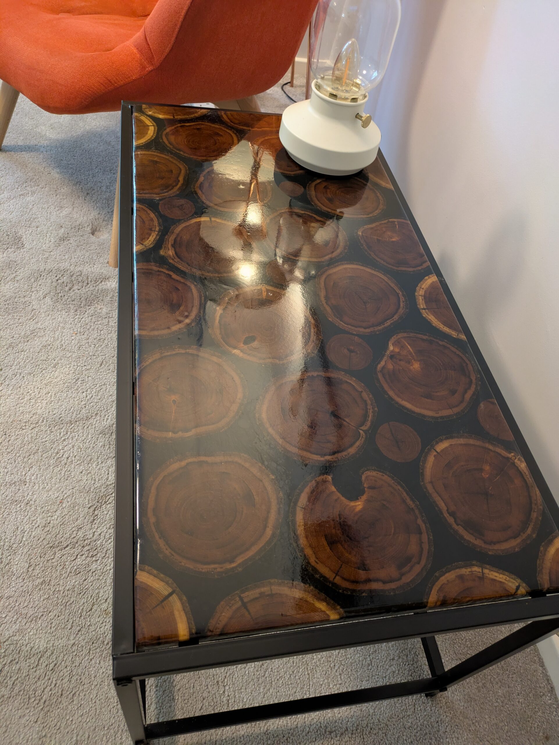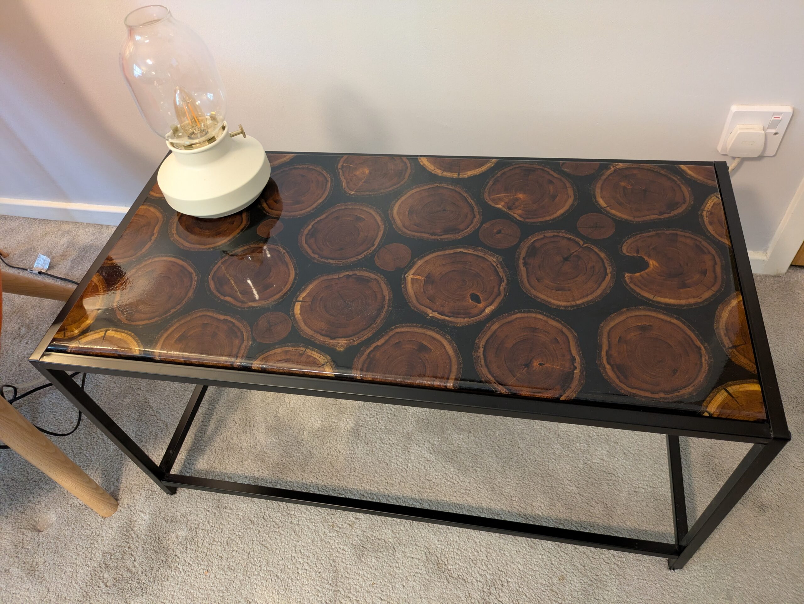 Gorgeous table featuring log slices set into black epoxy resin, finished with a hard-wearing gloss finish and sturdy metal legs.