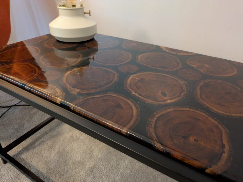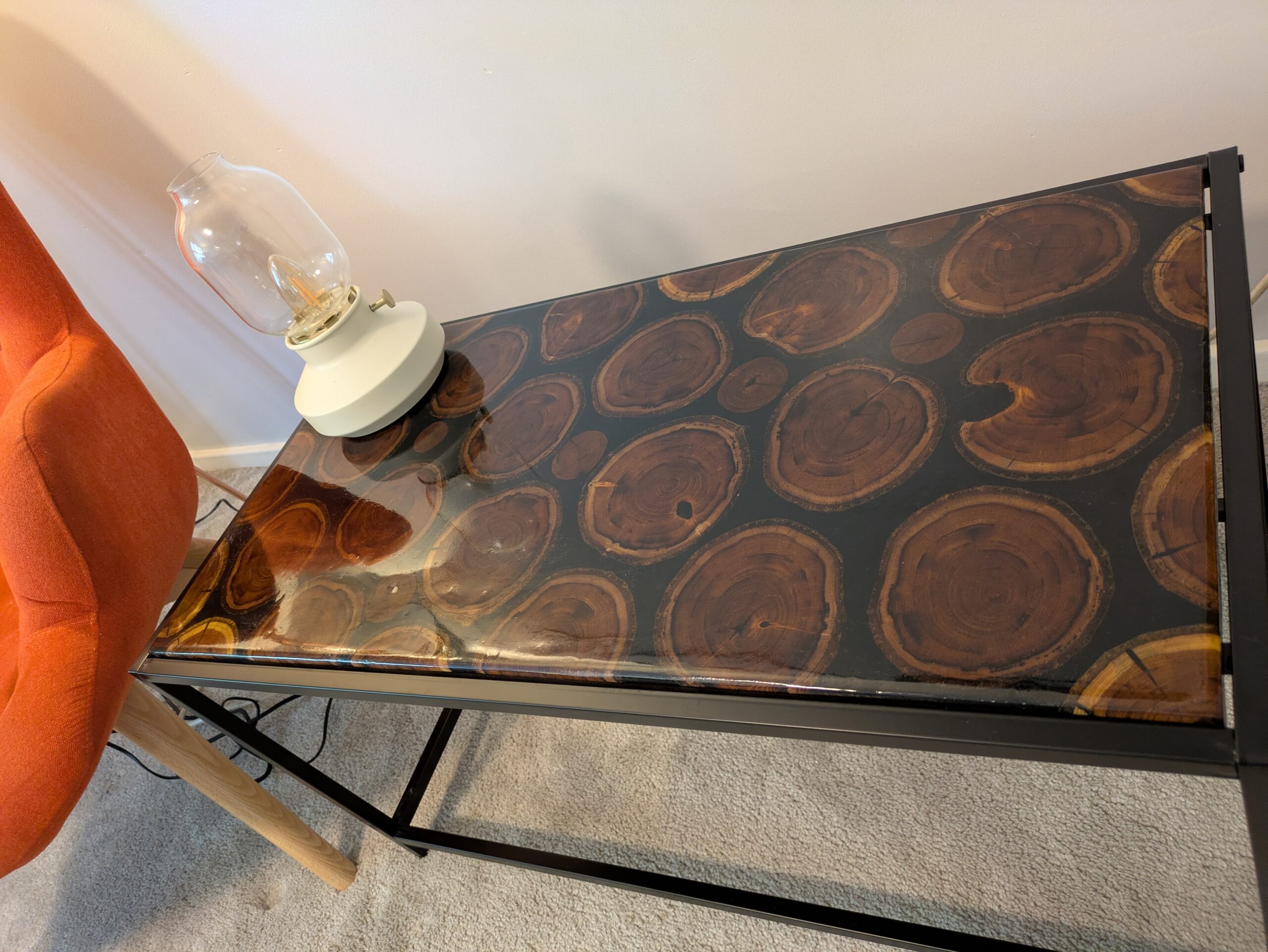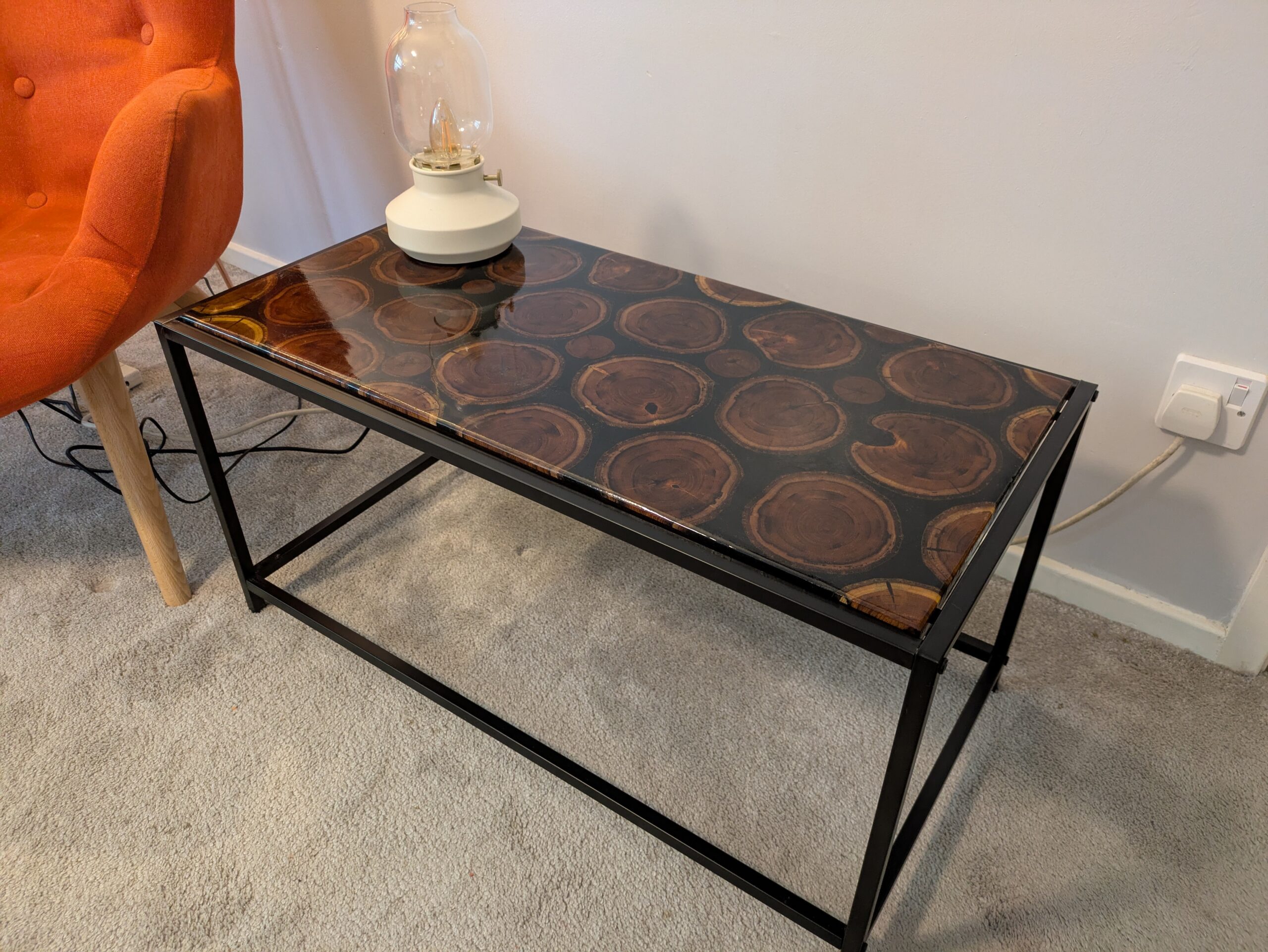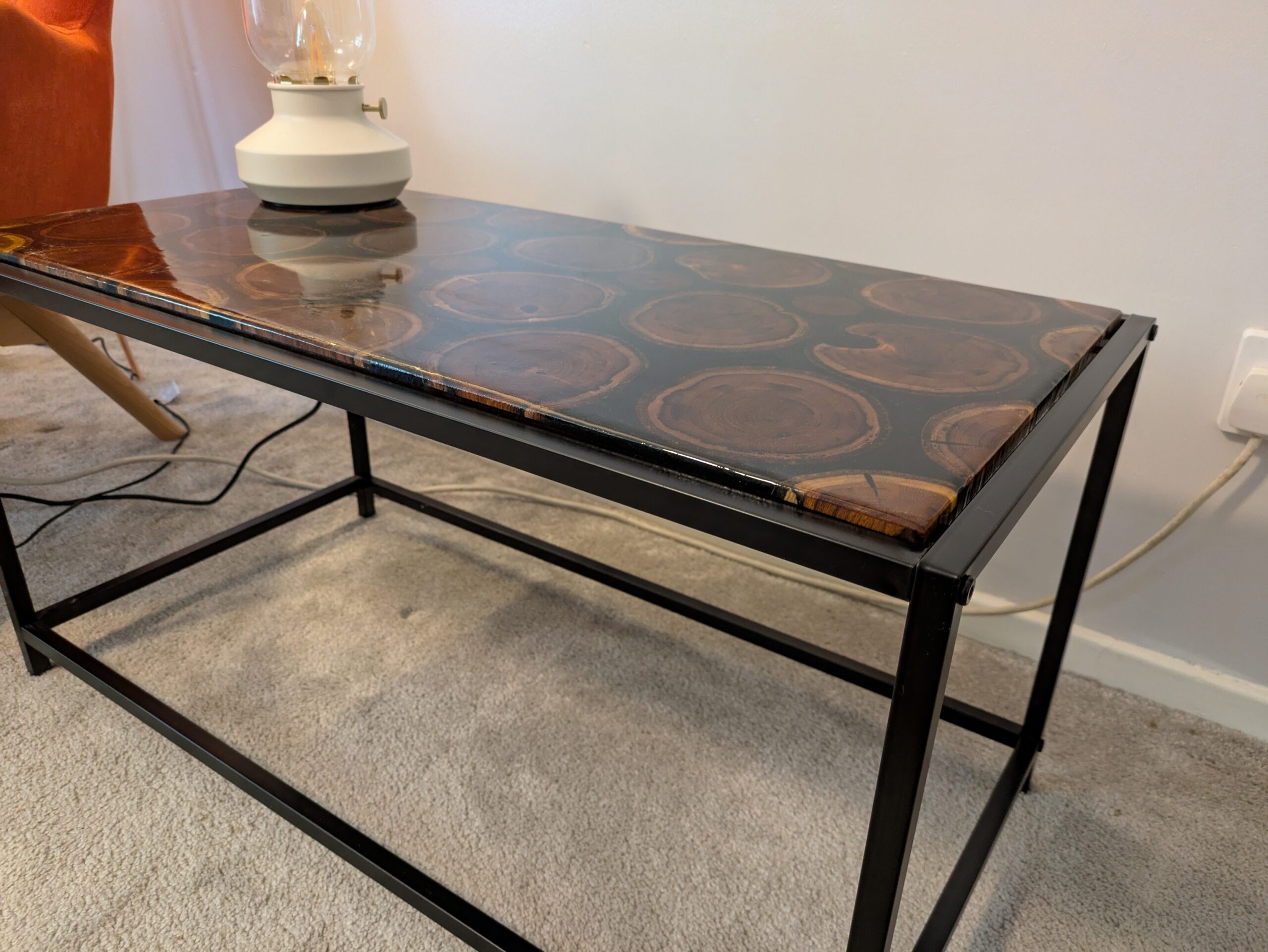 Gorgeous table featuring log slices set into black epoxy resin, finished with a hard-wearing gloss finish and sturdy metal legs.
