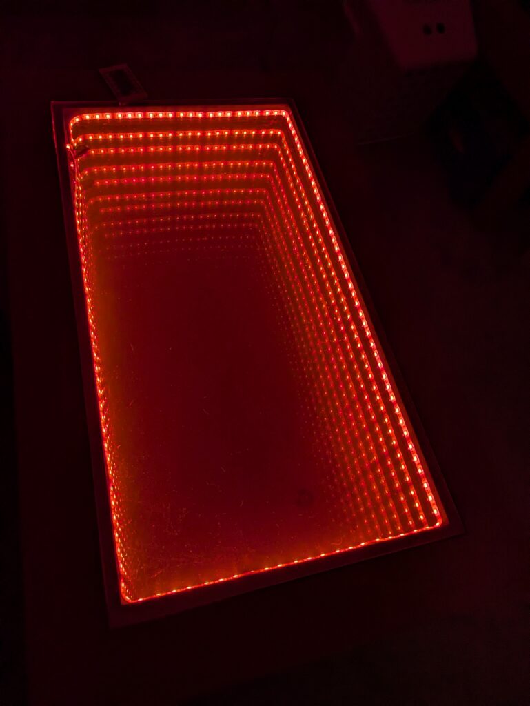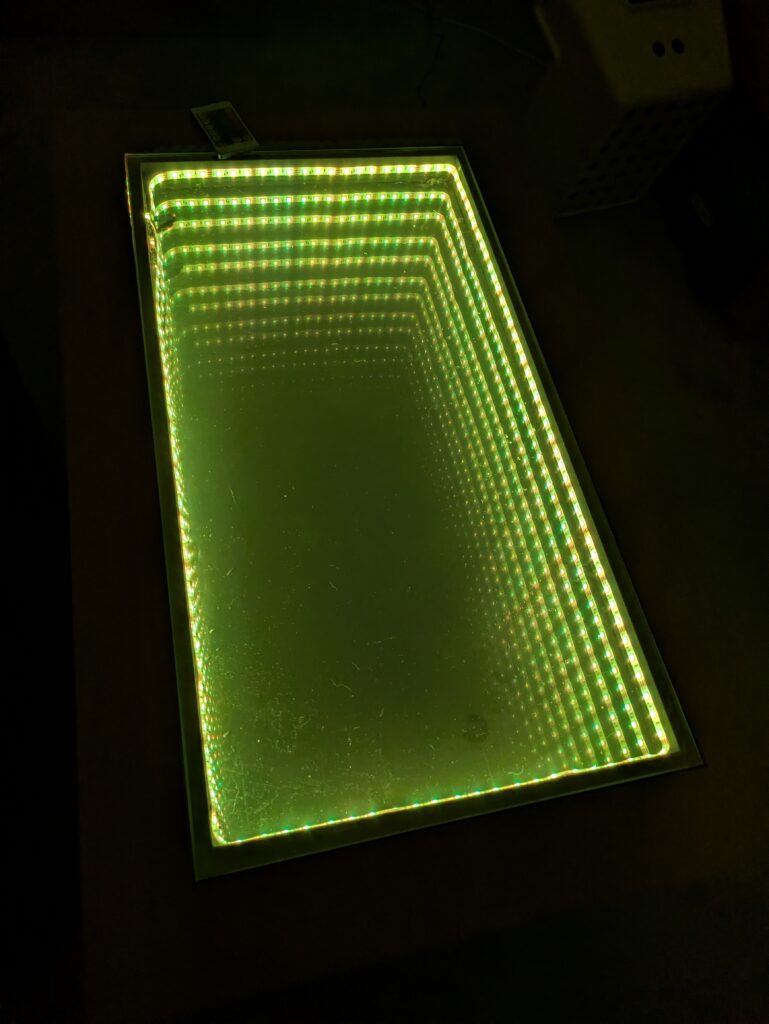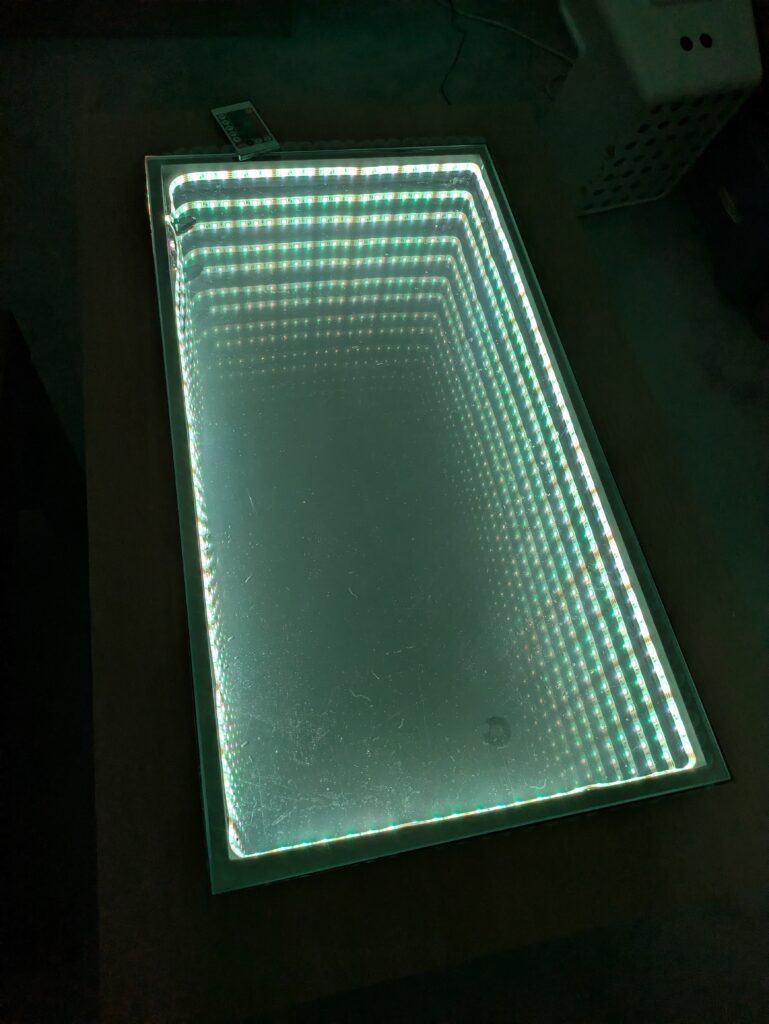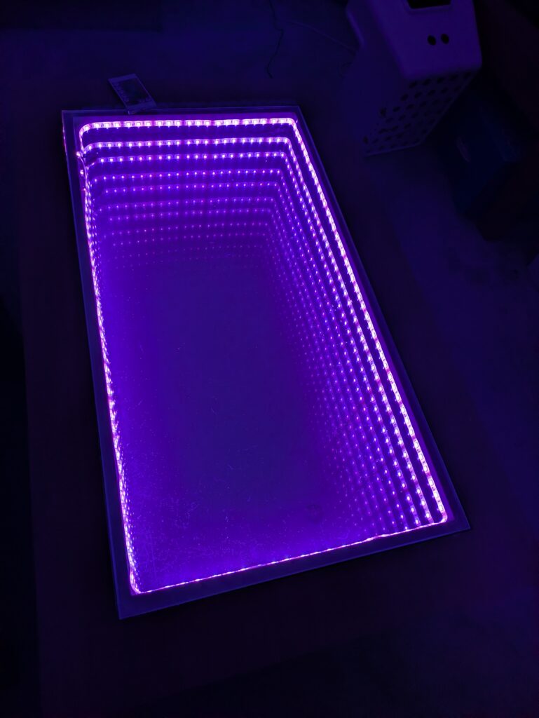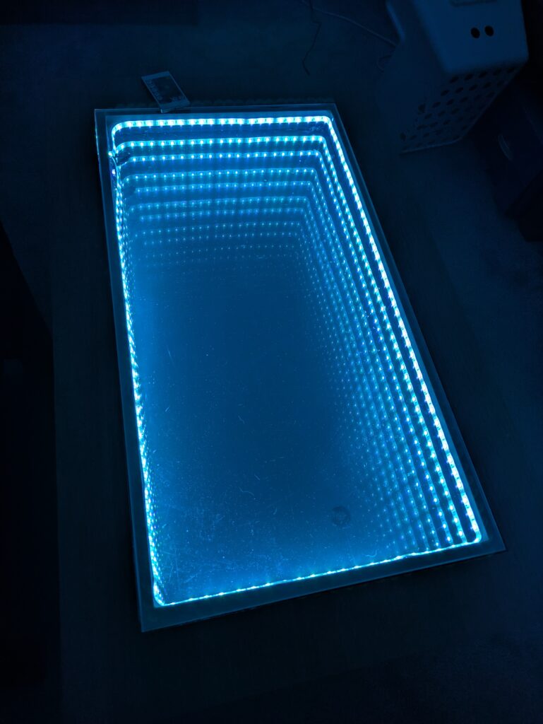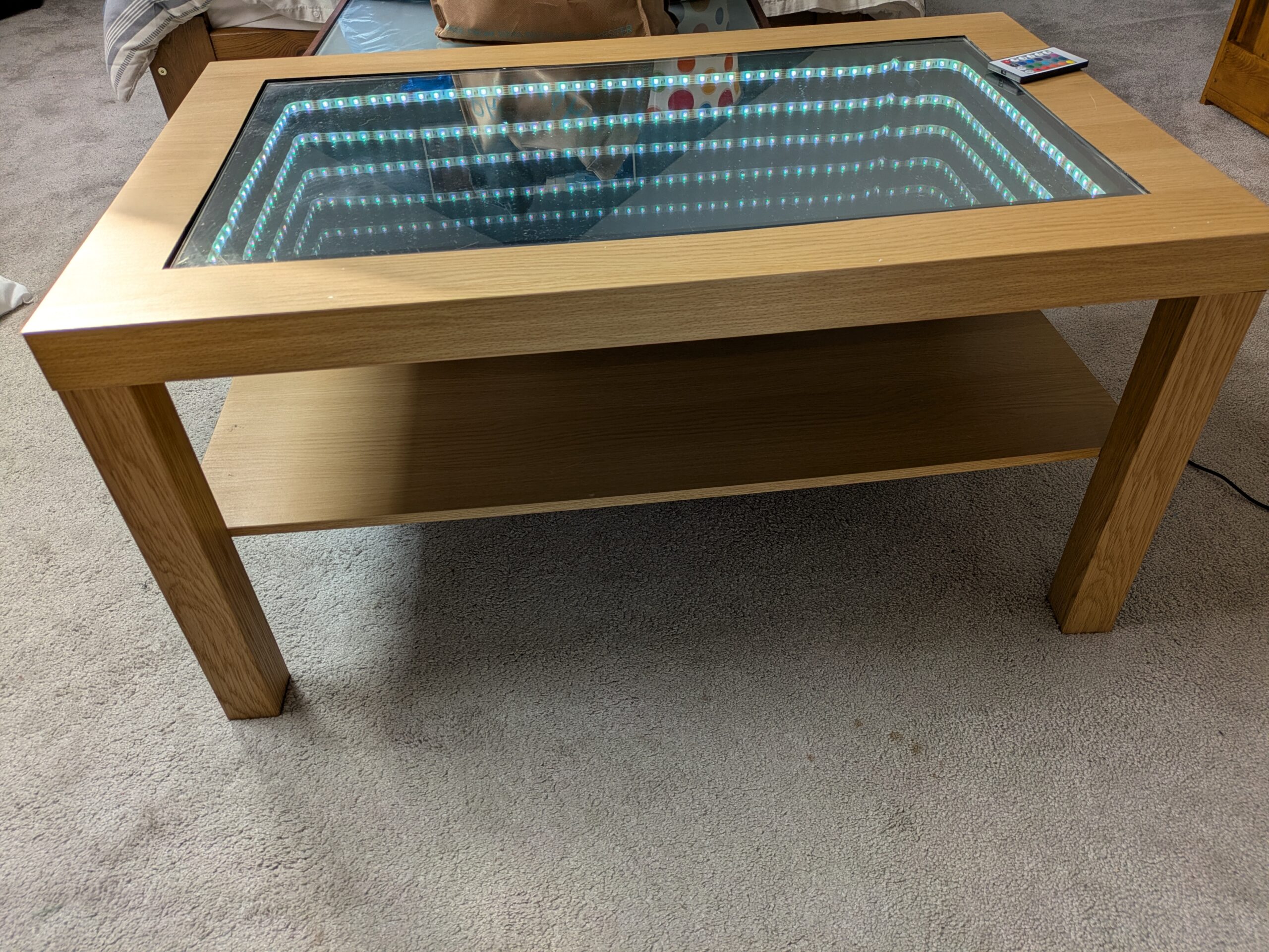 Innovative use of an old IKEA LACK coffee table. I made this by cutting out the core of the table and adding a mirrored base, wooden frame and toughened glass top with mirrored film underneath. This gives the inifinity “well” effect when the string of LEDs are lit up.